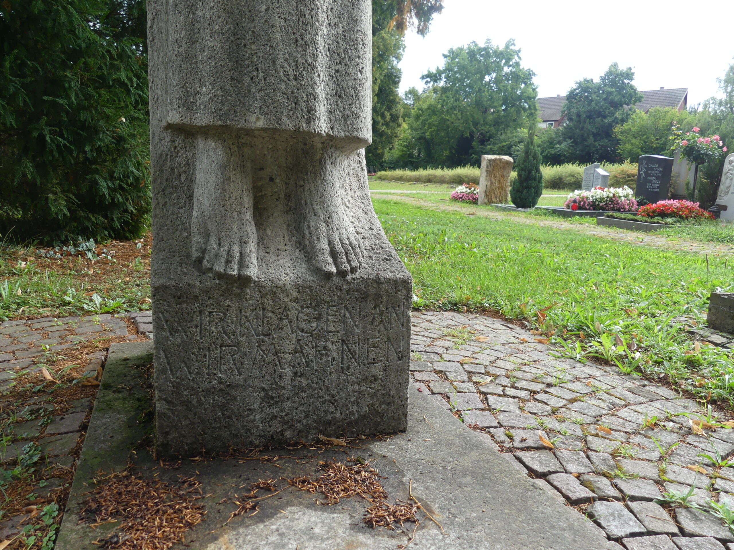 Das Mahnmal für Luftkriegsopfer zeigt die in Stein gehauene Darstellung eines toten Mädchens. Auf allen vier Seiten des Sockels befinden sich Inschriften. Die Vorderseite trägt den Appell: „Wir klagen an / wir mahnen.“ Auf der rechten Seite sind die Daten der Luftangriffe vom 19. und 20. Oktober 1944 eingraviert, auf der linken Seite die vom 5. Mai 1942 und 21. Februar 1944. Die Rückseite zeigt eine alphabetisch geordnete Liste mit 26 Namen ziviler Opfer des Luftkriegs.