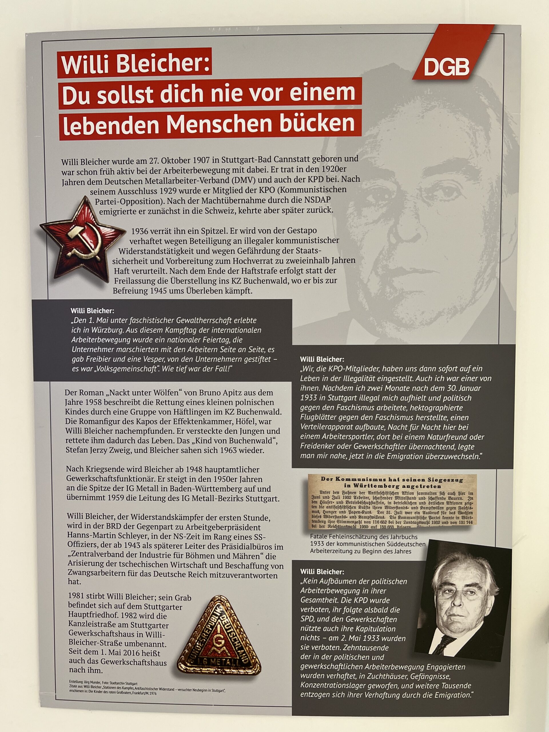 Willi Bleicher, geboren am 27. Oktober 1907 in Bad Cannstatt, wurde nach einer Bäckerlehre und frühem gewerkschaftlichem Engagement Jugendleiter des Deutschen Metallarbeiter-Verbandes in Stuttgart. In den 1920er Jahren trat er in die Kommunistische Partei Deutschlands ein, aus der er nach wenigen Jahren ausgeschlossen wurde. Wegen seines gewerkschaftlichen und politischen Engagements wurde er von den Nationalsozialisten verfolgt und 1936 verhaftet. Er war neun Jahre in Haft, unter anderem im Konzentrationslager Buchenwald, wo er Teil des Häftlingswiderstands war. Dort half er ein polnisches Kind zu retten – eine Tat, für die er später von Israel den Ehrentitel „Gerechter unter den Völkern“ erhielt. 1945 überlebte Willi Bleicher Todesmärsche im Erzgebirge.