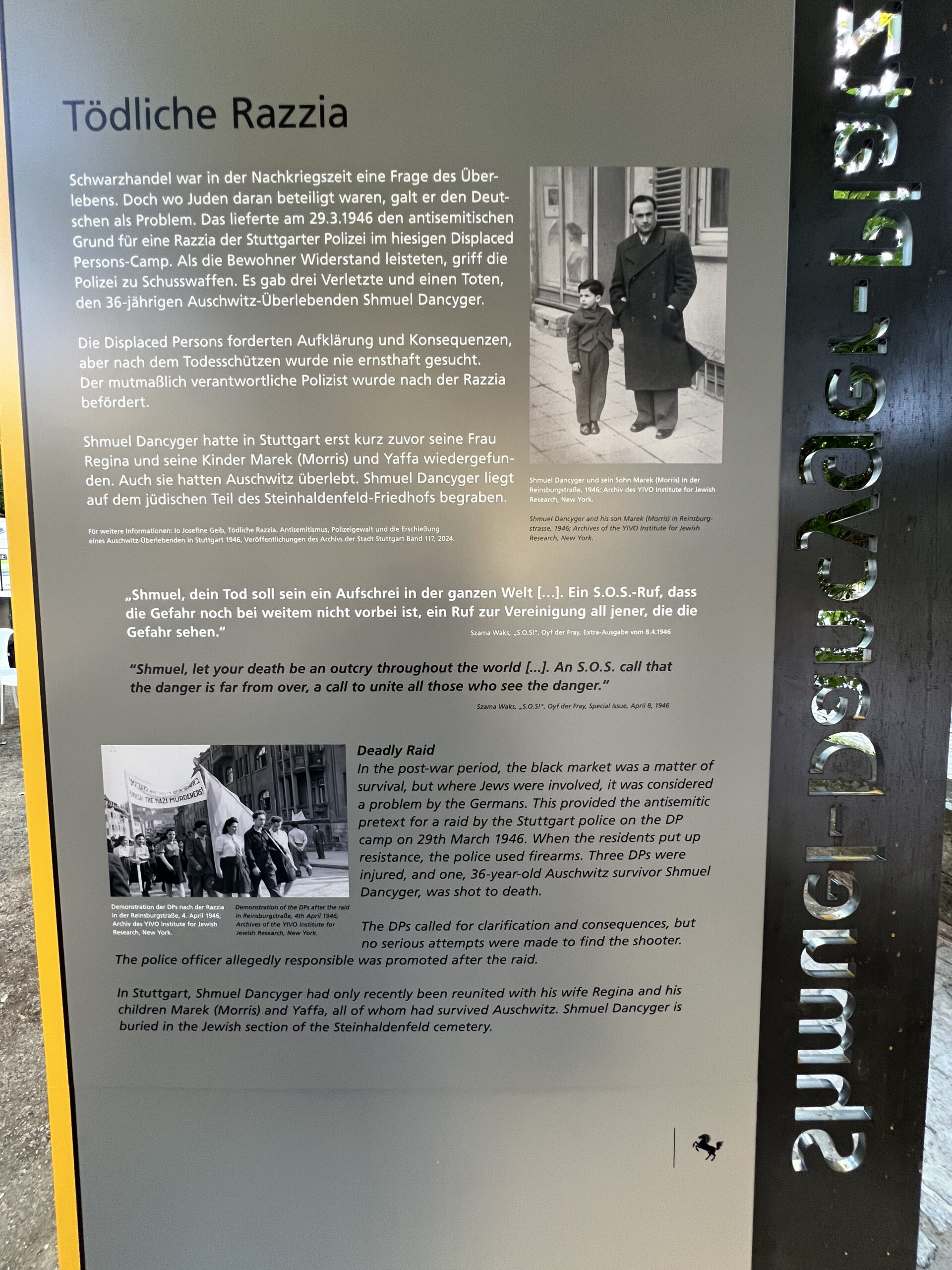 Shmuel Dancyger hatte die Konzentrationslager Auschwitz und Mauthausen überlebt und seine Frau und beiden Kinder im DP-Center Stuttgart-West wieder gefunden. Er wurde auf dem Israelitischen Friedhof Bad Cannstatt bestattet.
